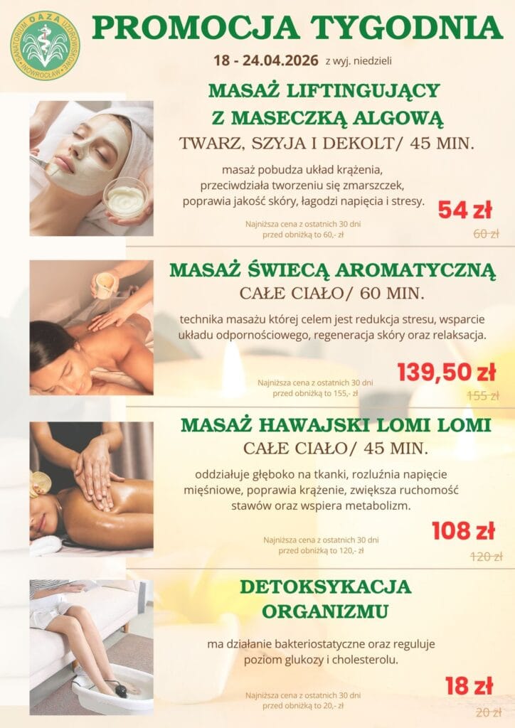 Serdecznie zapraszamy Państwa do skorzystania z wyjątkowej promocji tygodnia na zabiegi. To doskonała okazja, aby zadbać o zdrowie, relaks i dobre samopoczucie w atrakcyjnej cenie.